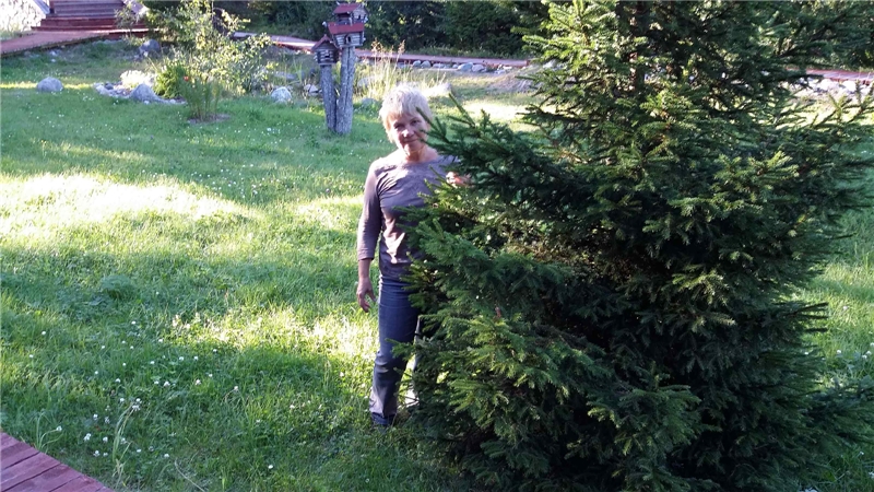 Валя с елкой у гостиницы.